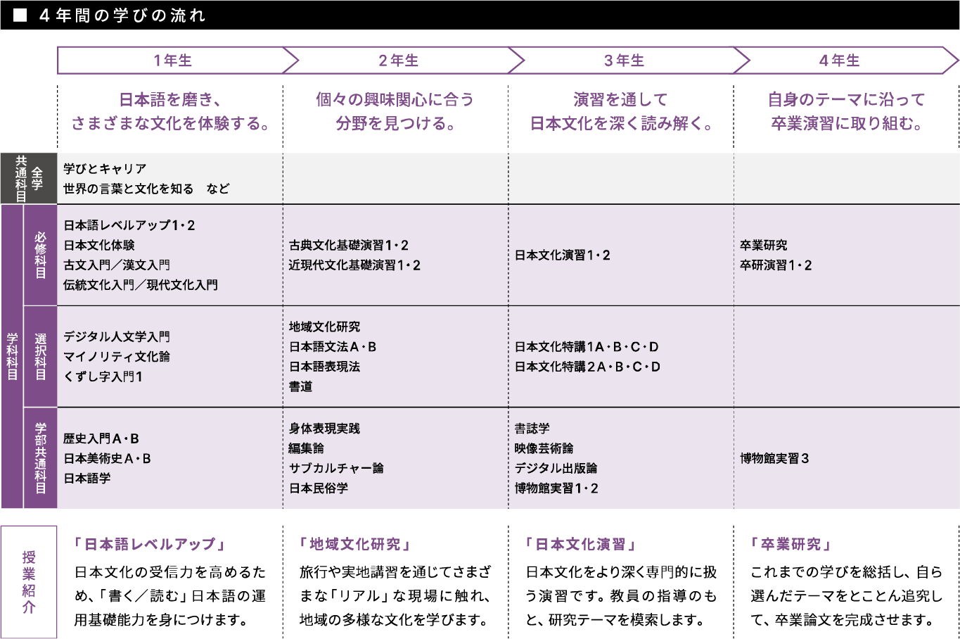 日本文化を深く専門的に学ぶ演習形式の授業となっており、古典文学や中世の芸能、視覚文化など、教員ごとのテーマに沿って、自分の関心に合った研究を進めます。例えば、狂言の台本を読み解いて当時の言葉や暮らしを探ったり、『源氏物語』を原文で味わいながら平安文化を分析したりします。また、美術作品を題材にした発表や、日本語のしくみを客観的に考察する授業もあり、発表やレポートを通じて、自分の考えを深めつつ伝える力を養います。このように、日本文化の奥深さに触れながら、研究の楽しさを実感できる授業となっています。